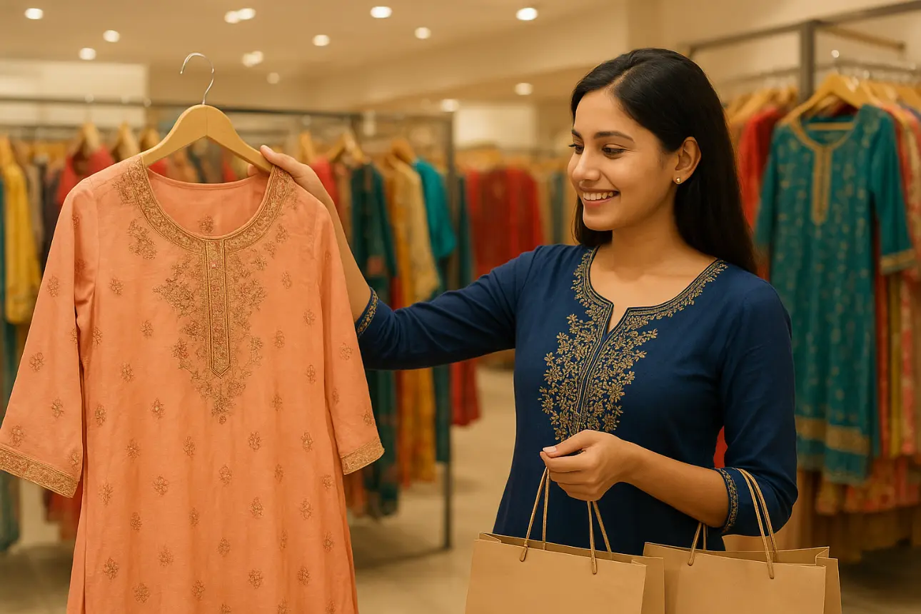 In this vibrant image, a young woman is seen shopping for traditional Indian attire at an ethnic clothing store. She is smiling warmly as she admires a peach-colored kurta with intricate golden embroidery, which she holds up for a closer look.